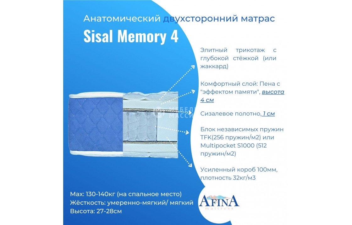 двусторонний Матрас Sisal Memory 4 / Coir от фабрики афина с пружинным блоком tfk-256 (256 пружин на кв. метр) или multi-512 (512 пружин на кв. метр) на выбор. чехол жаккард стёганный 180-220 гр/м2 или элитный трикотаж с объёмной стёжкой 300гр/м2 на выбор. купите по цене производителя в интернет-магазине мебель массив.| Размер | Цена | |